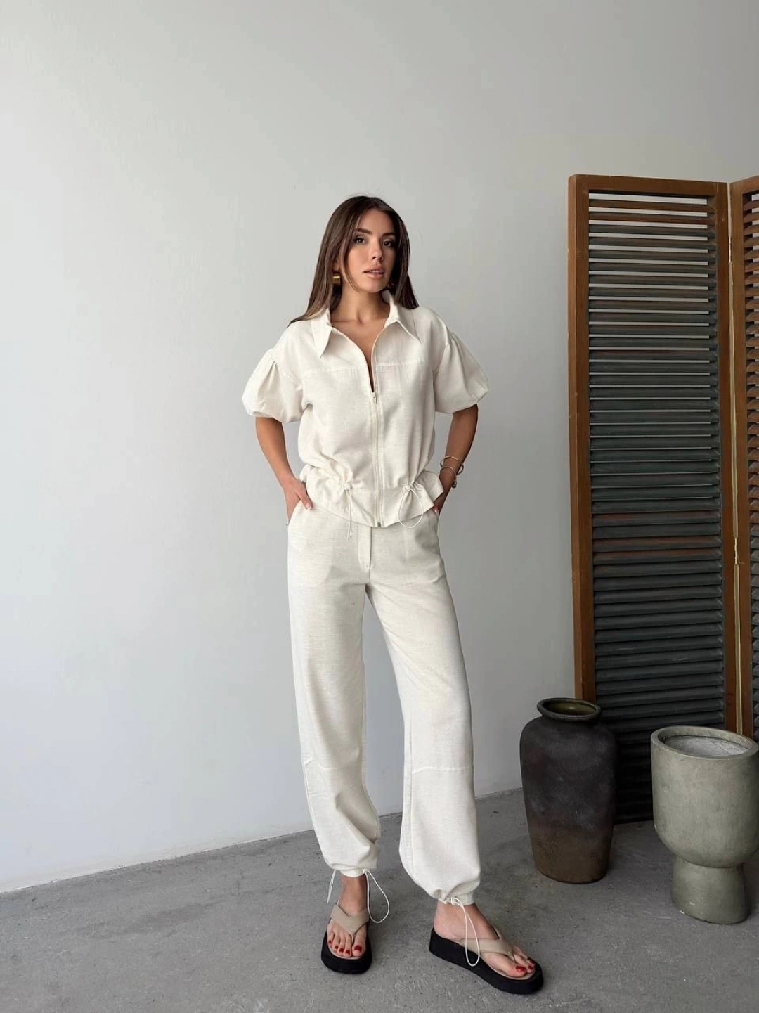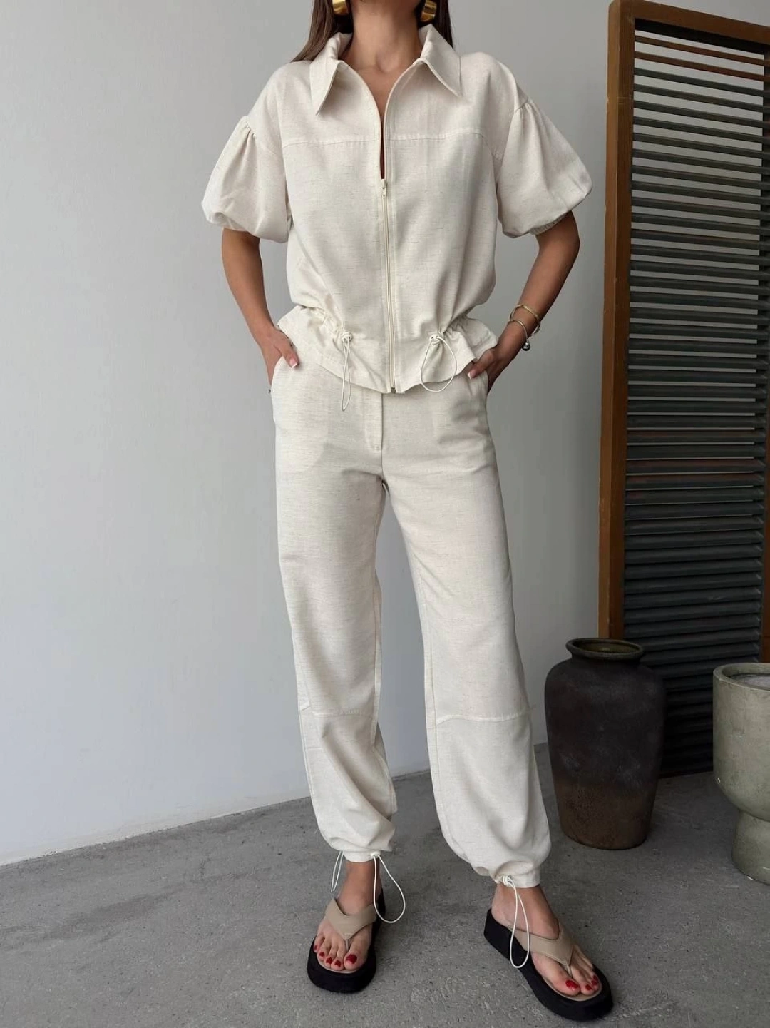 Detay | Beli Lastıklı , Bol Paça , Cepli , Kısa Kollu , Kollar Balon lastikli , Tam Fermuarlı , Yakalı |