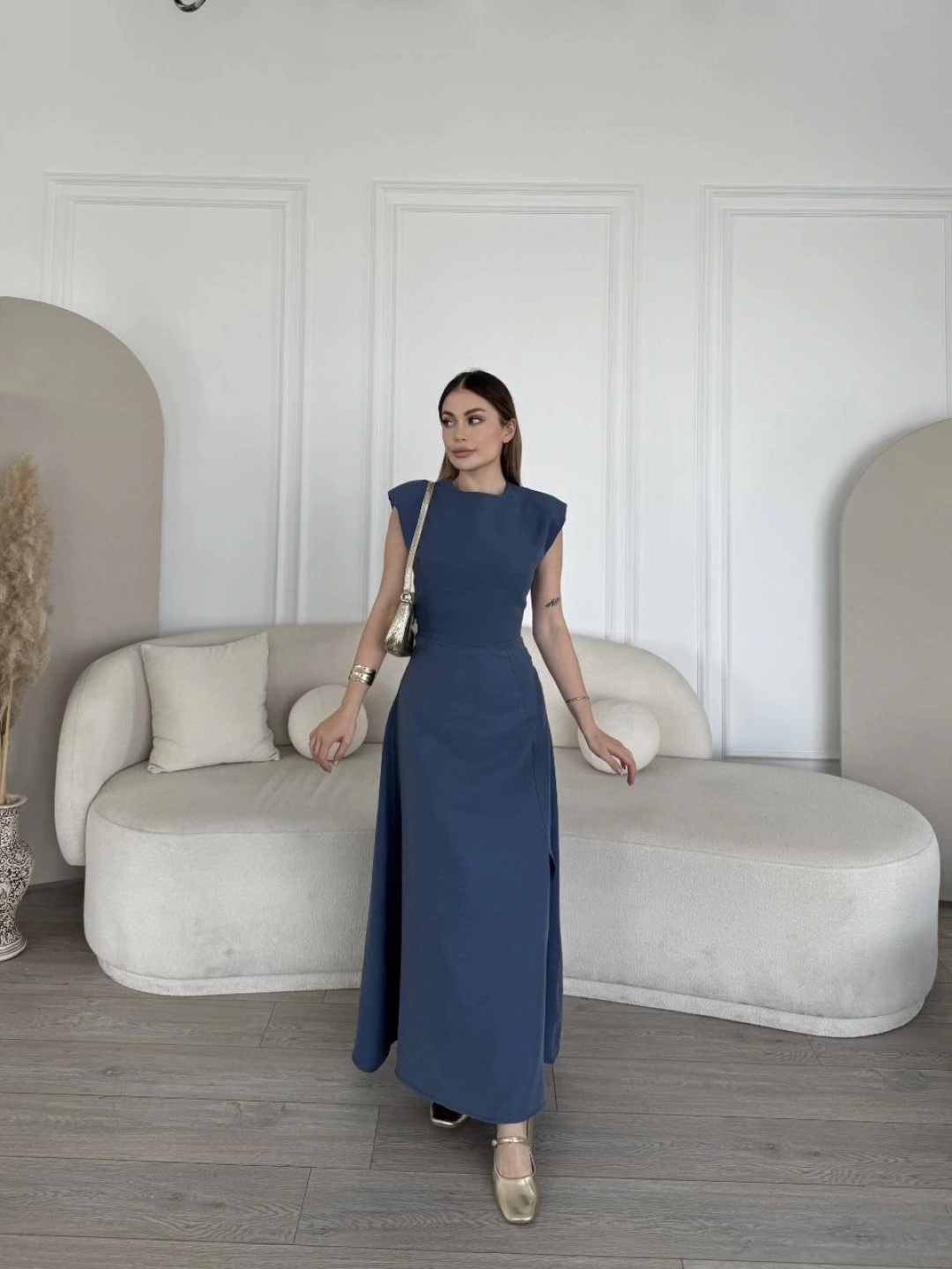 Detay | Bisiklet Yaka , Kolsuz , Sırtı Fermuarlı , Sırtı kapalı , Uzun Elbise , Yandan kısa Yırtmaçlı |