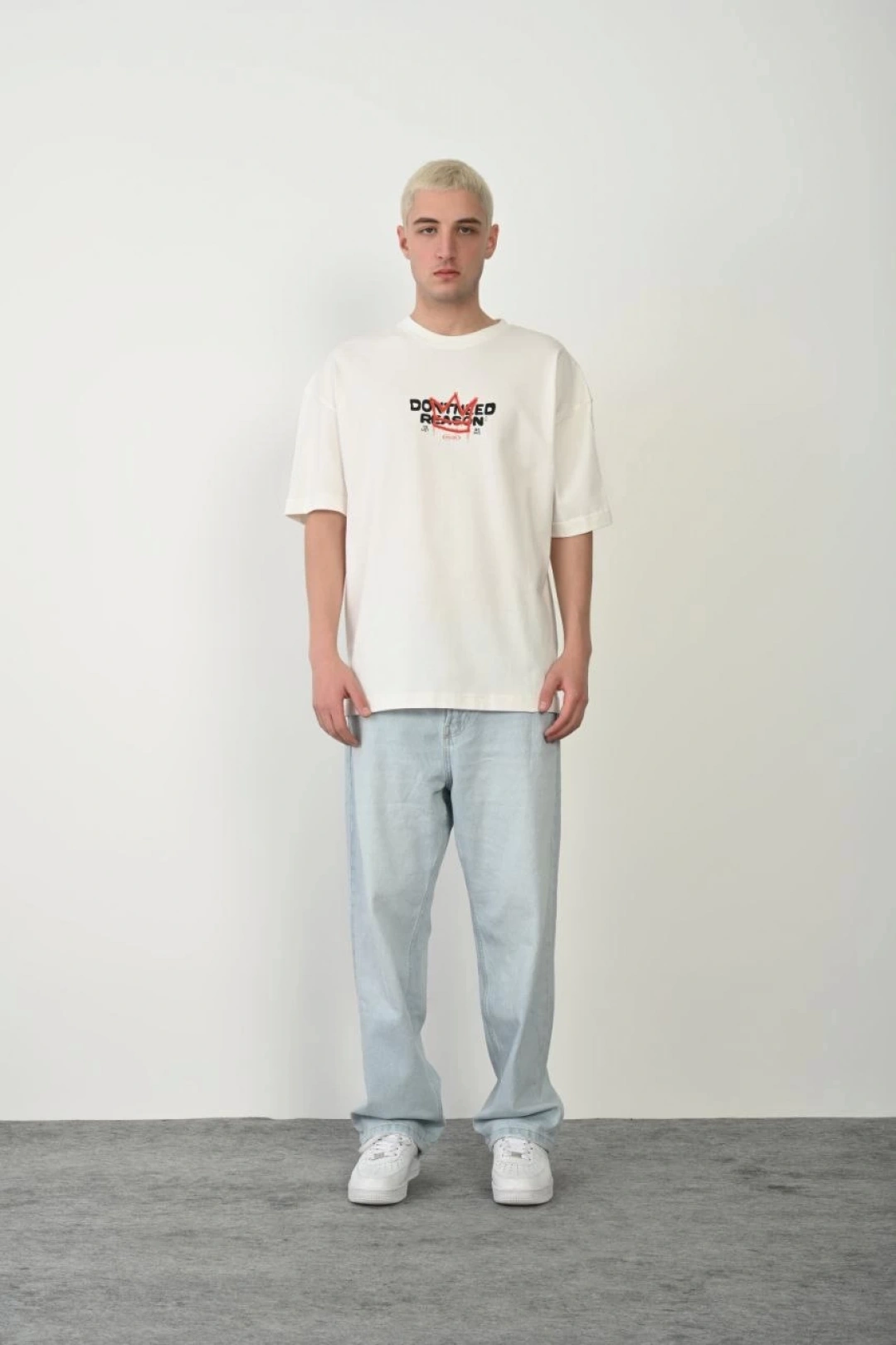 Unisex Baskılı Bisiklet Yaka Oversize T-Shirt - Beyaz