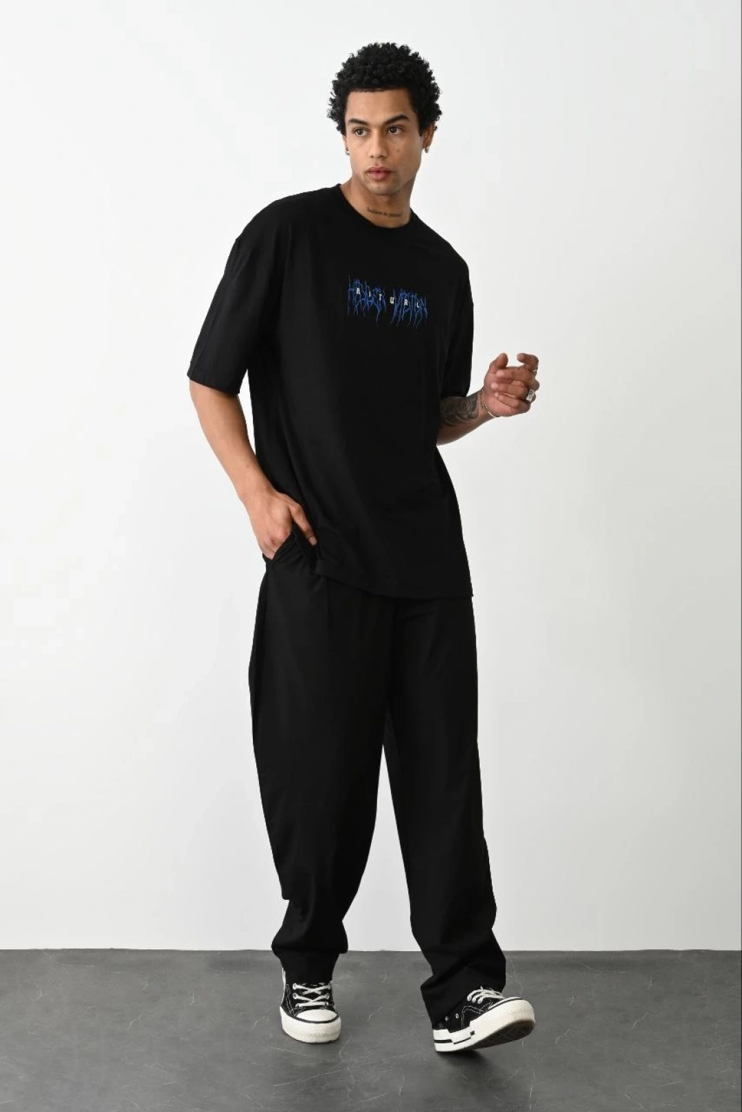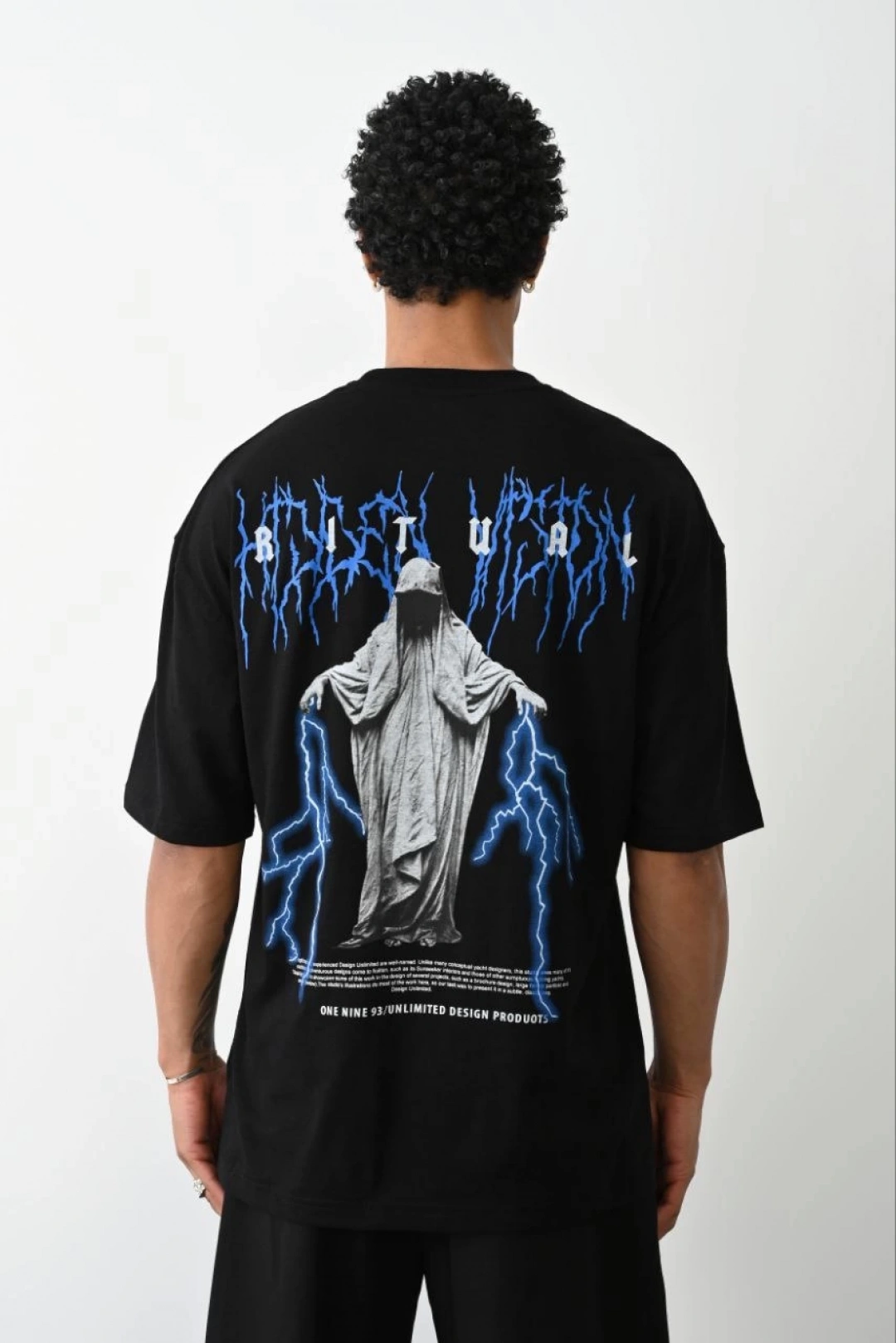 Benzersiz Sırt Baskılı Erkek Sokak Stili Bol Tişört - Nefes Alabilir Polyester, Makinede Yıkanabilir - Siyah