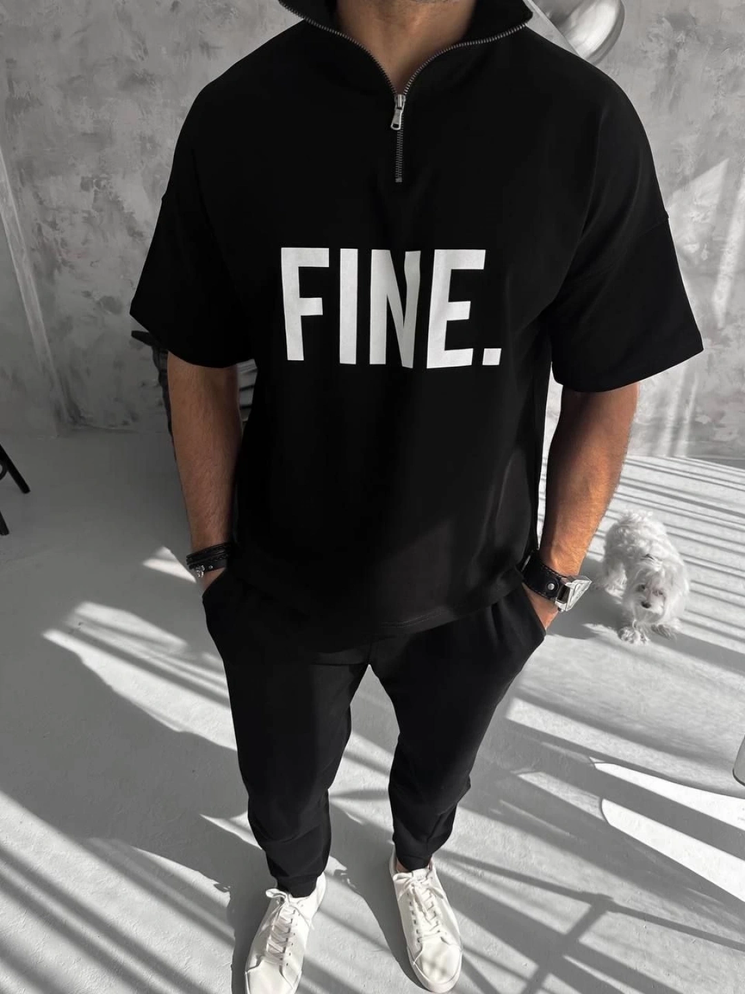 Unisex Baskılı Yarım Fermuarlı T-Shirt - Siyah