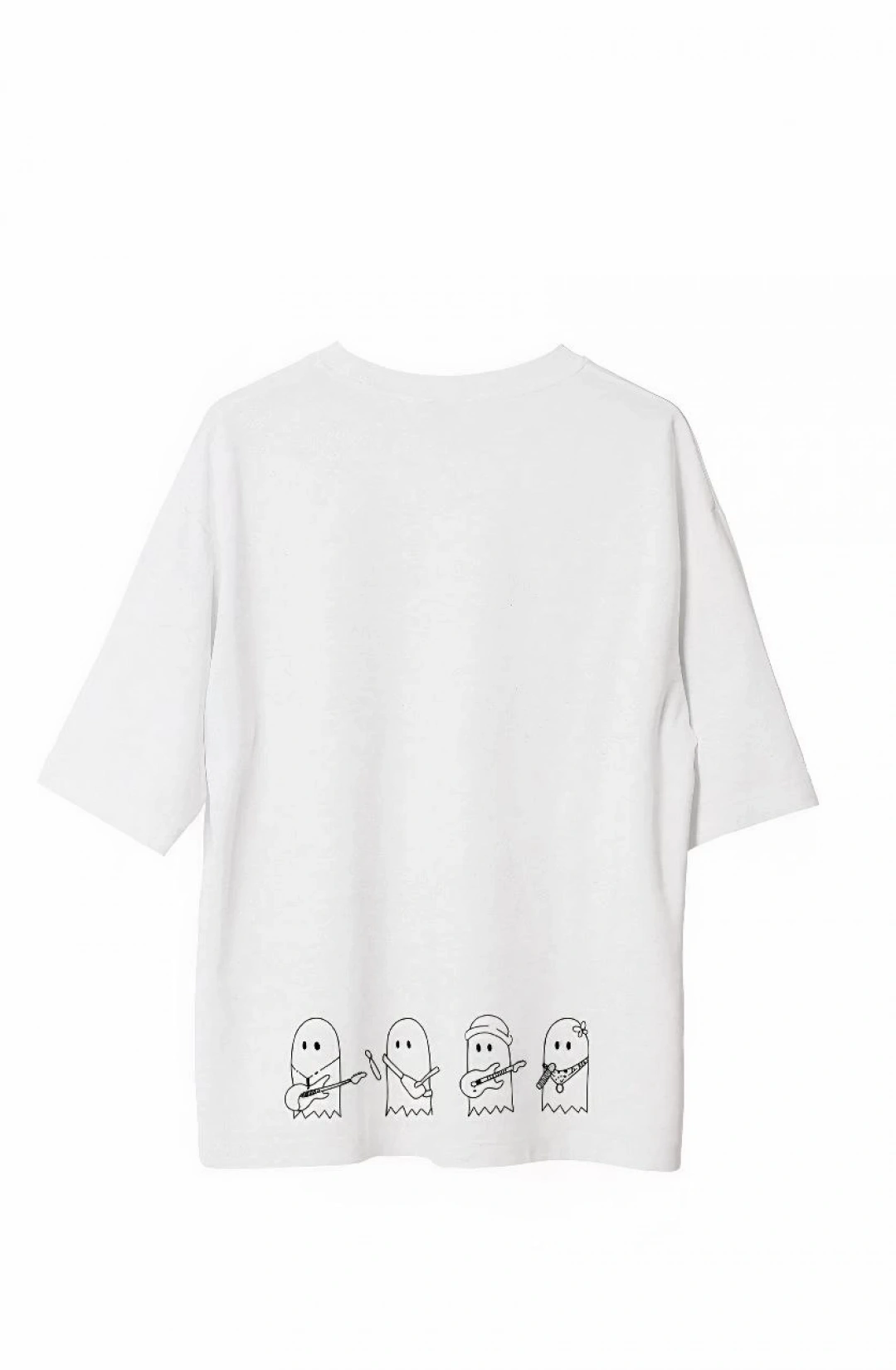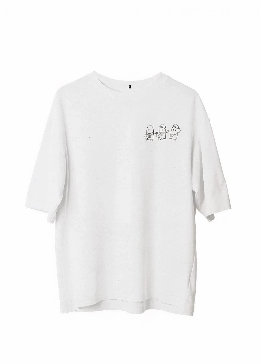 Unisex Bisiklet Yaka Baskılı Oversize T-Shirt - Beyaz