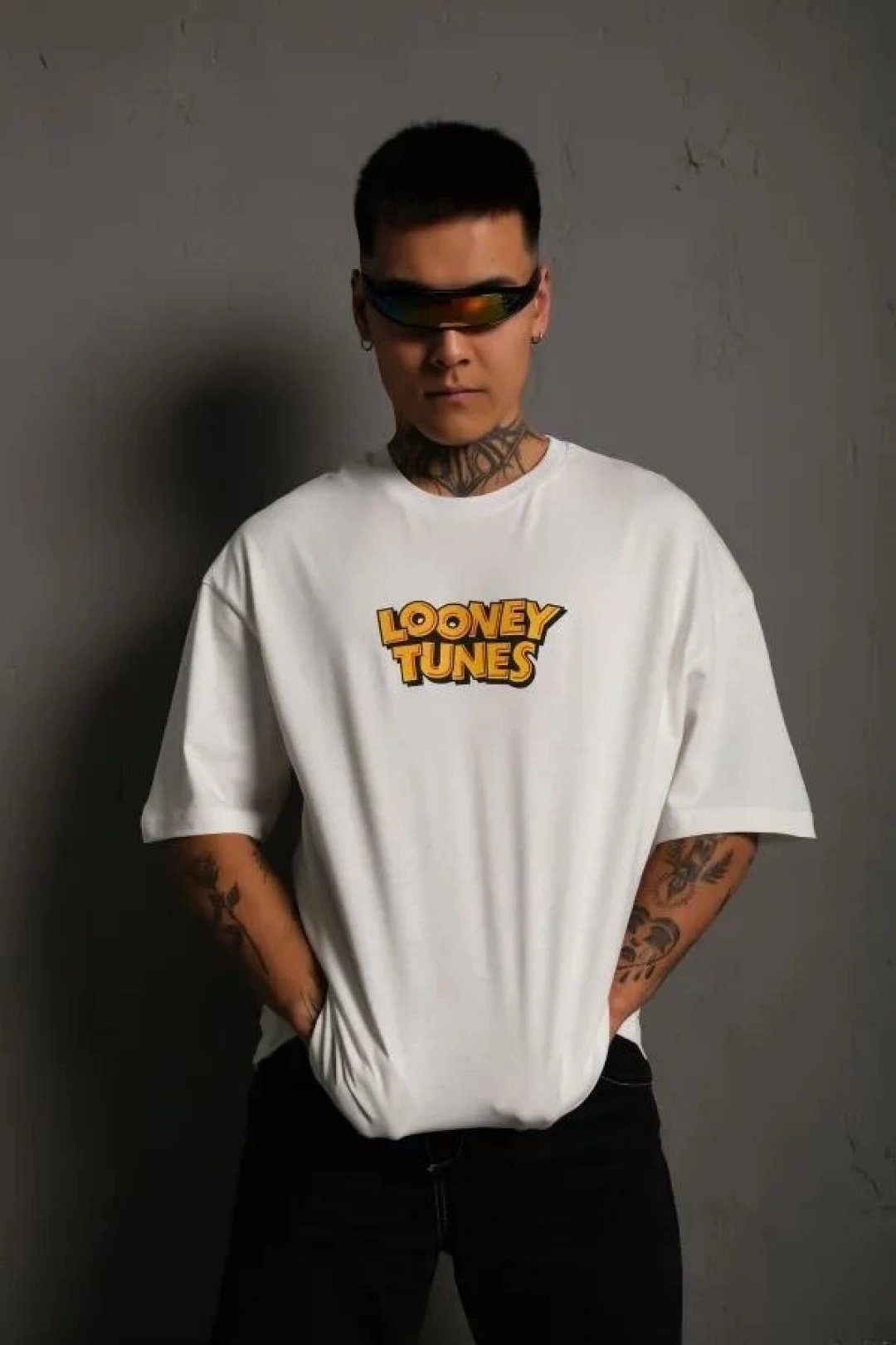 Güneş Gözlüğü Grafikli Karikatür Tavşan Oversize Kısa Kollu Tişört Çift Tişört, İlkbahar Ve Yaz - Beyaz