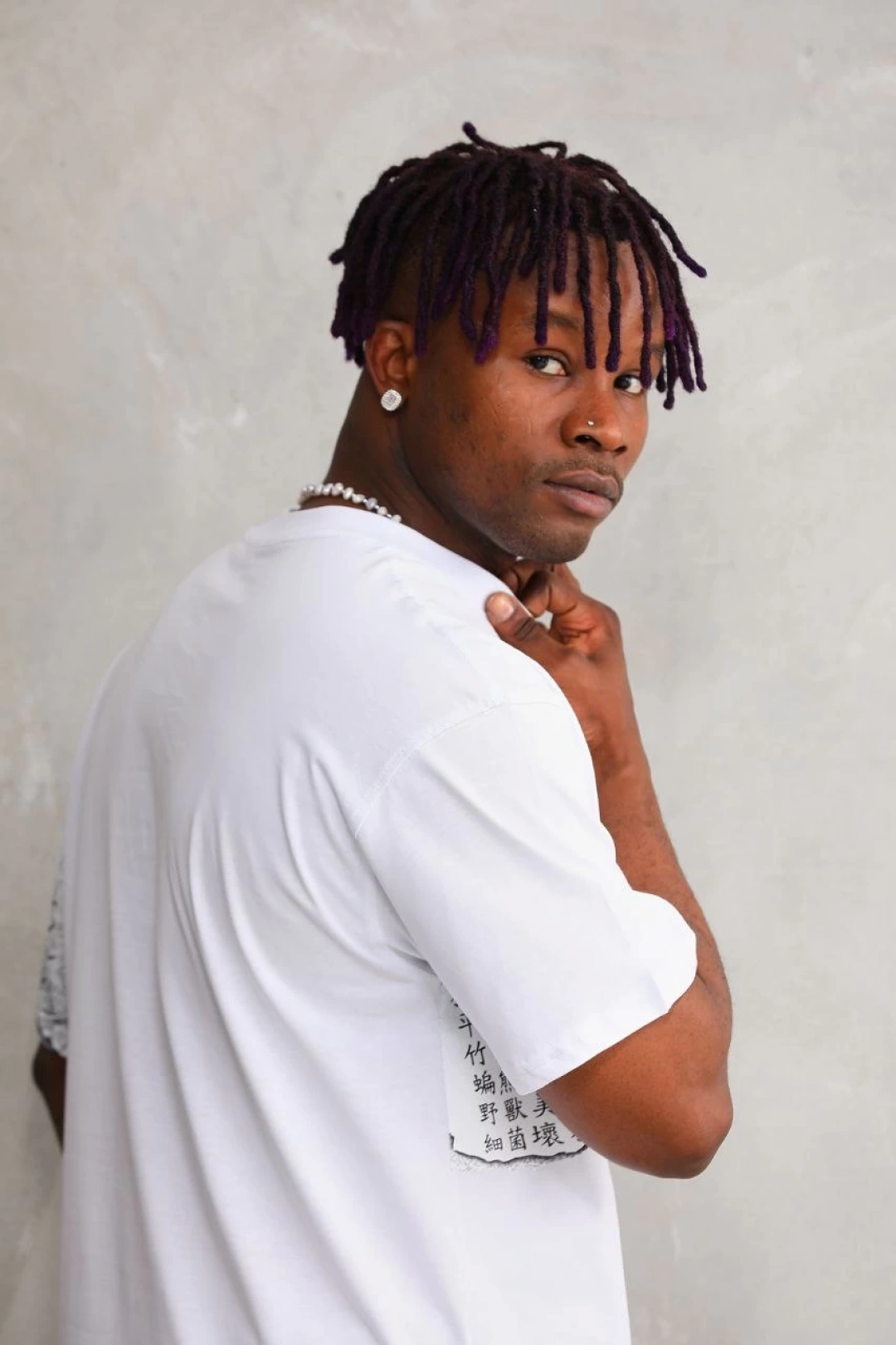Erkek OversizeGrafik Tişört "CAMPBRASTCOOPERATION" Kalın Yazı Bisiklet Yaka, Kısa Kol, Kalın Mor ve Siyah Desenli Yazlık Sokak Kıyafeti - Beyaz