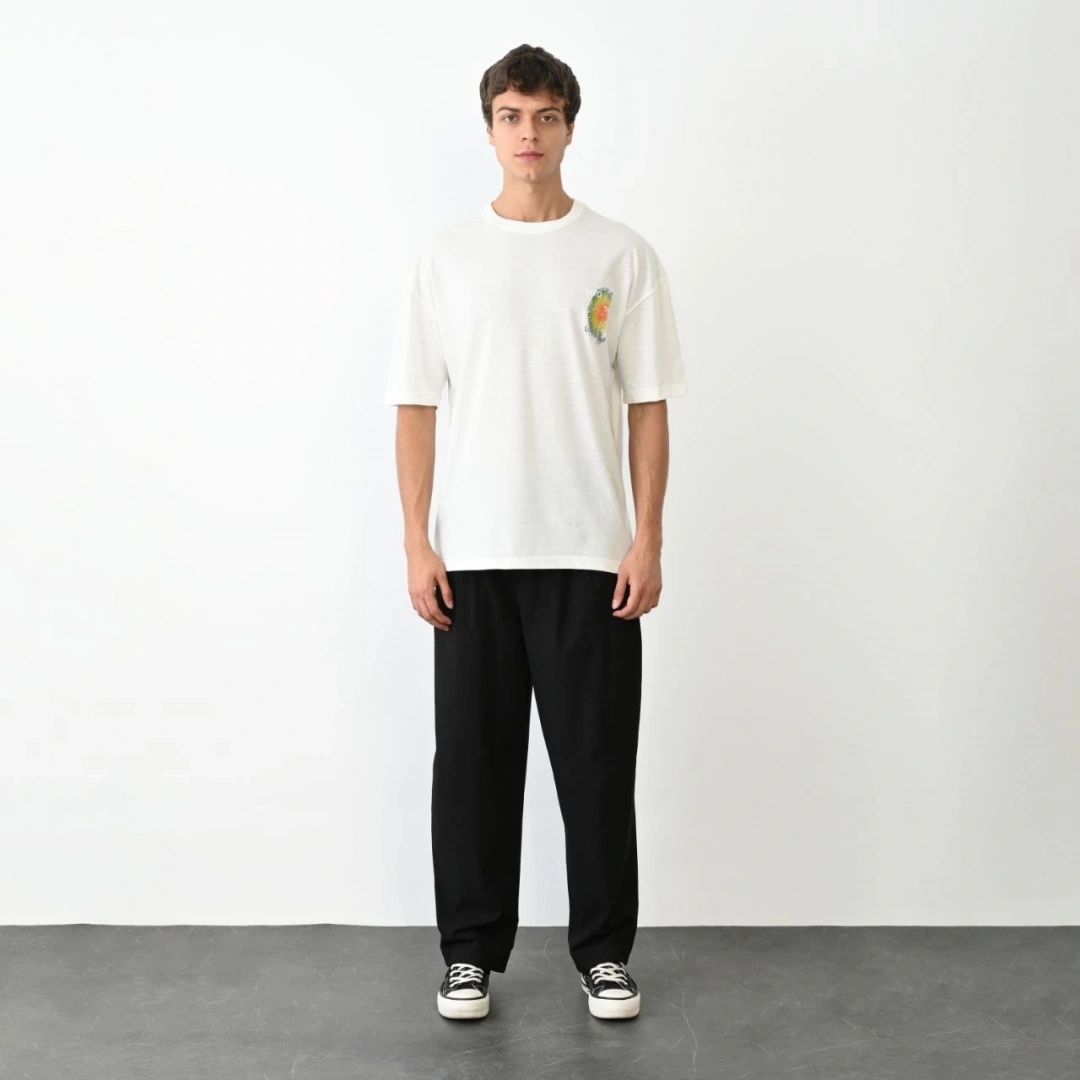 Unisex Bisiklet Yaka Baskılı Oversize T-Shirt - Beyaz