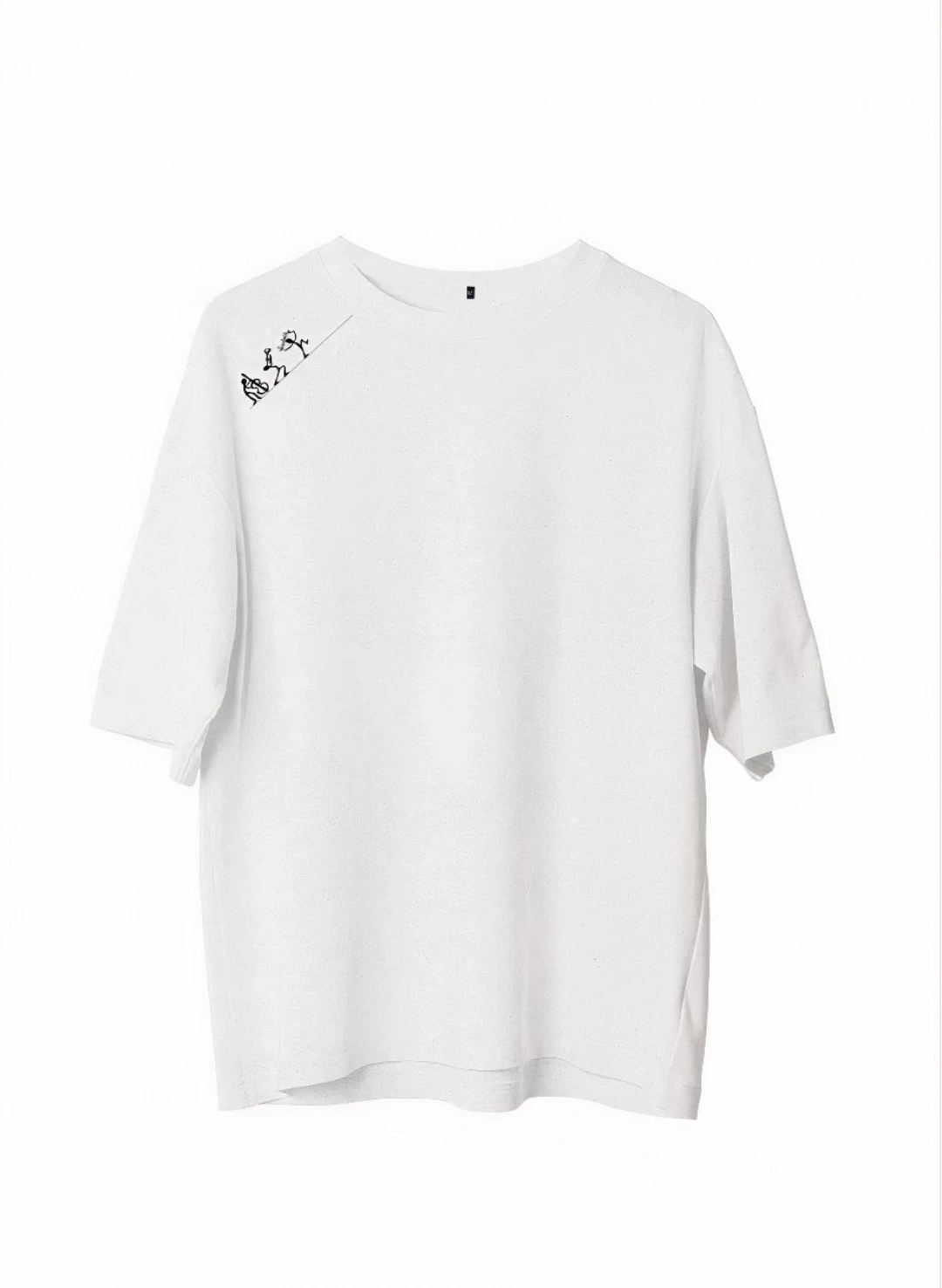 Unisex Bisiklet Yaka Baskılı Oversize T-Shirt - Beyaz