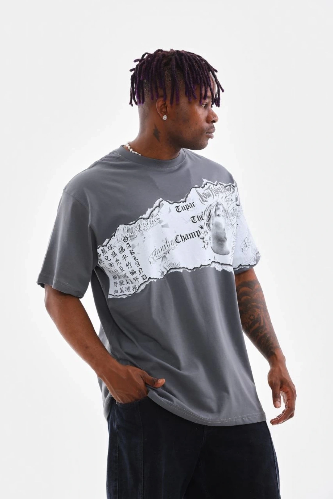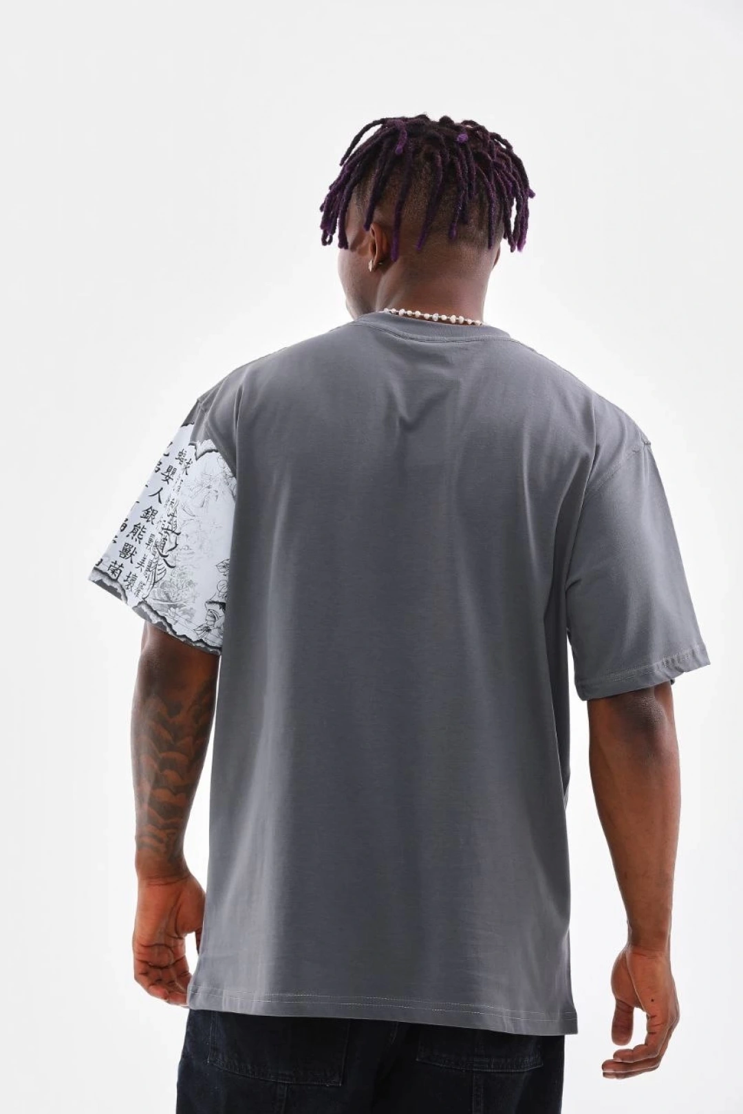 Unisex Bisiklet Yaka Baskılı Oversize T-Shirt - Gri