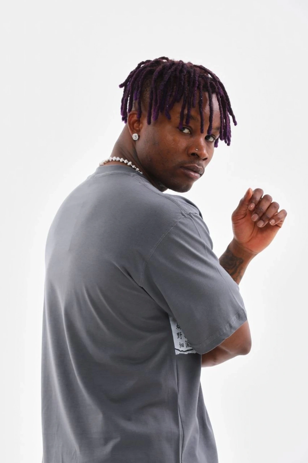 Erkek OversizeGrafik Tişört "CAMPBRASTCOOPERATION" Kalın Yazı Bisiklet Yaka, Kısa Kol, Kalın Mor ve Siyah Desenli Yazlık Sokak Kıyafeti - Siyah