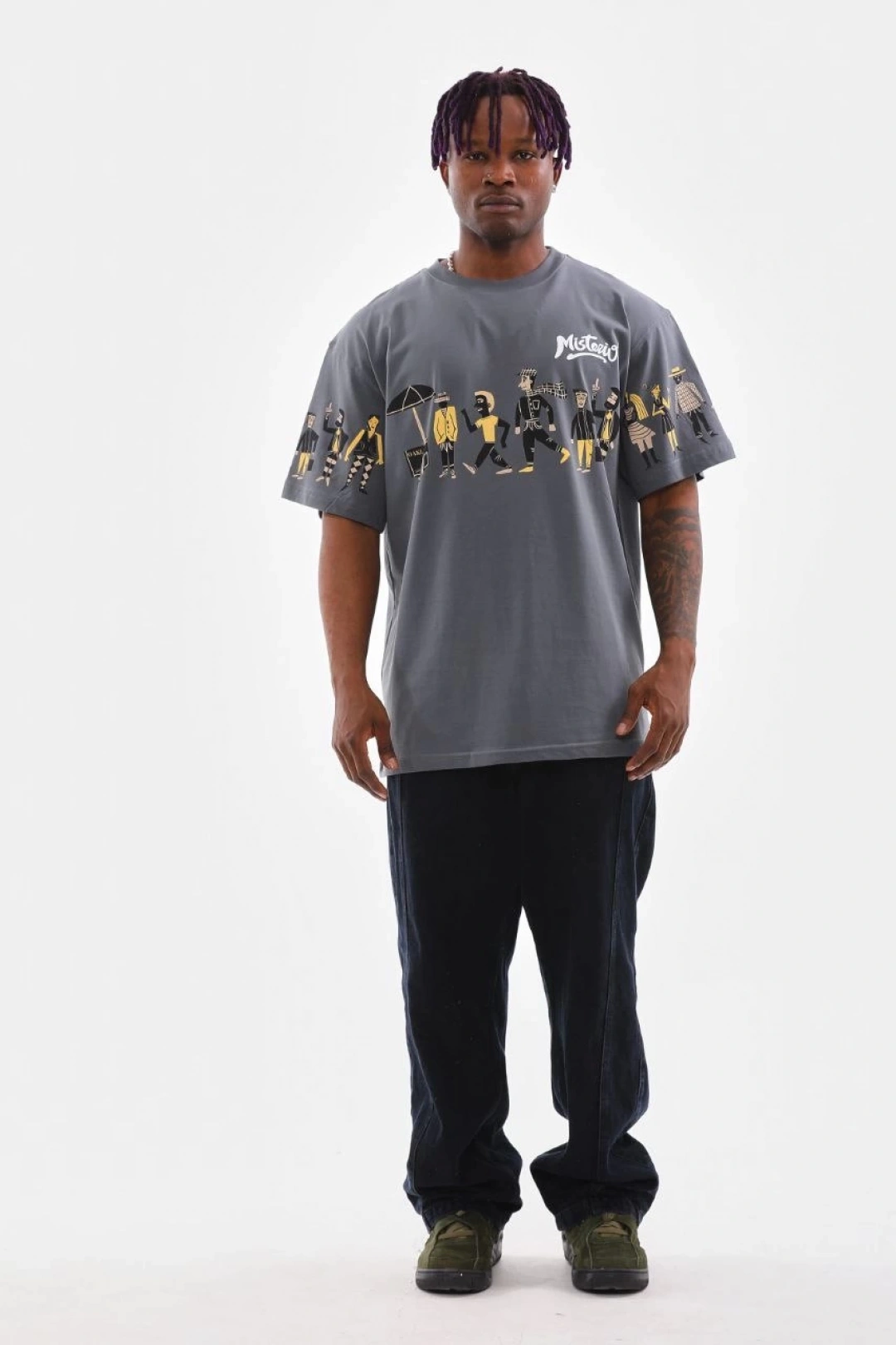 Unisex Bisiklet Yaka Baskılı Oversize T-Shirt - Gri