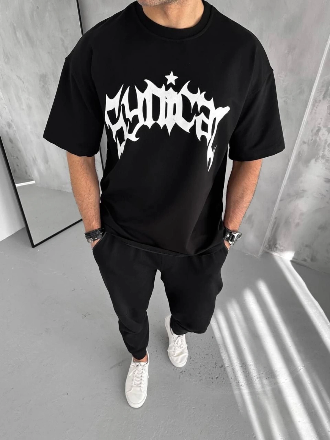 Unisex Bisiklet Yaka Baskılı Oversize T-Shirt - Siyah