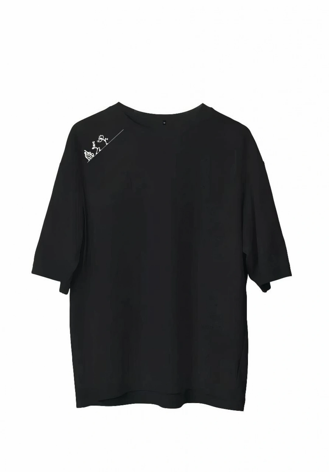 Unisex Bisiklet Yaka Baskılı Oversize T-Shirt - Siyah