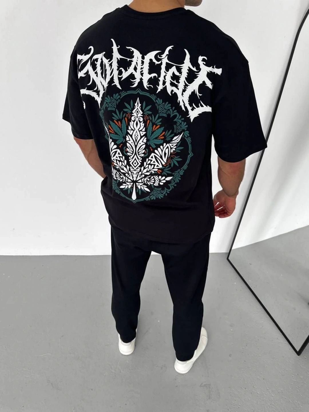 Benzersiz Sırt Baskılı Erkek Sokak Stili Bol Tişört - Nefes Alabilir Polyester, Makinede Yıkanabilir - Siyah