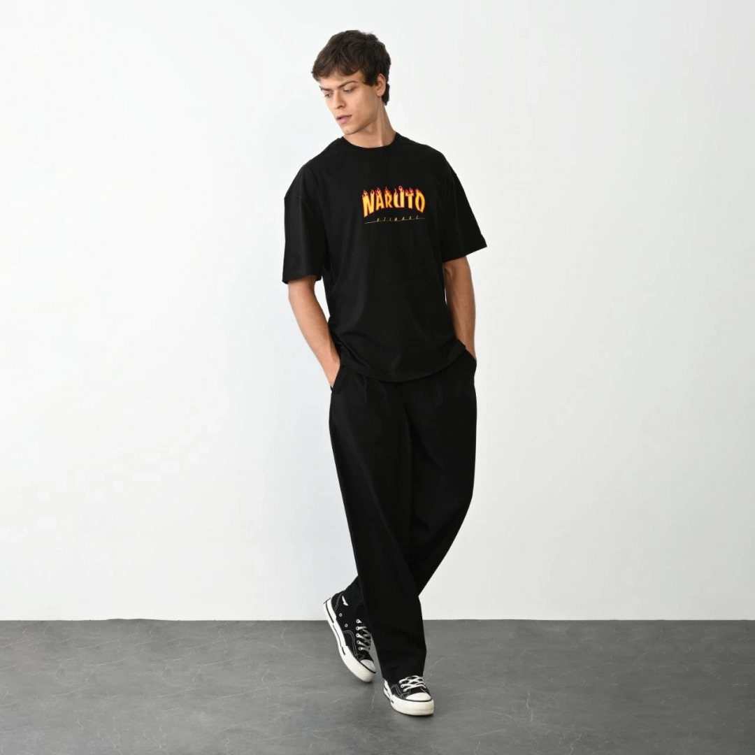 Benzersiz Sırt Baskılı Erkek Sokak Stili Bol Tişört - Nefes Alabilir Polyester, Makinede Yıkanabilir - Siyah