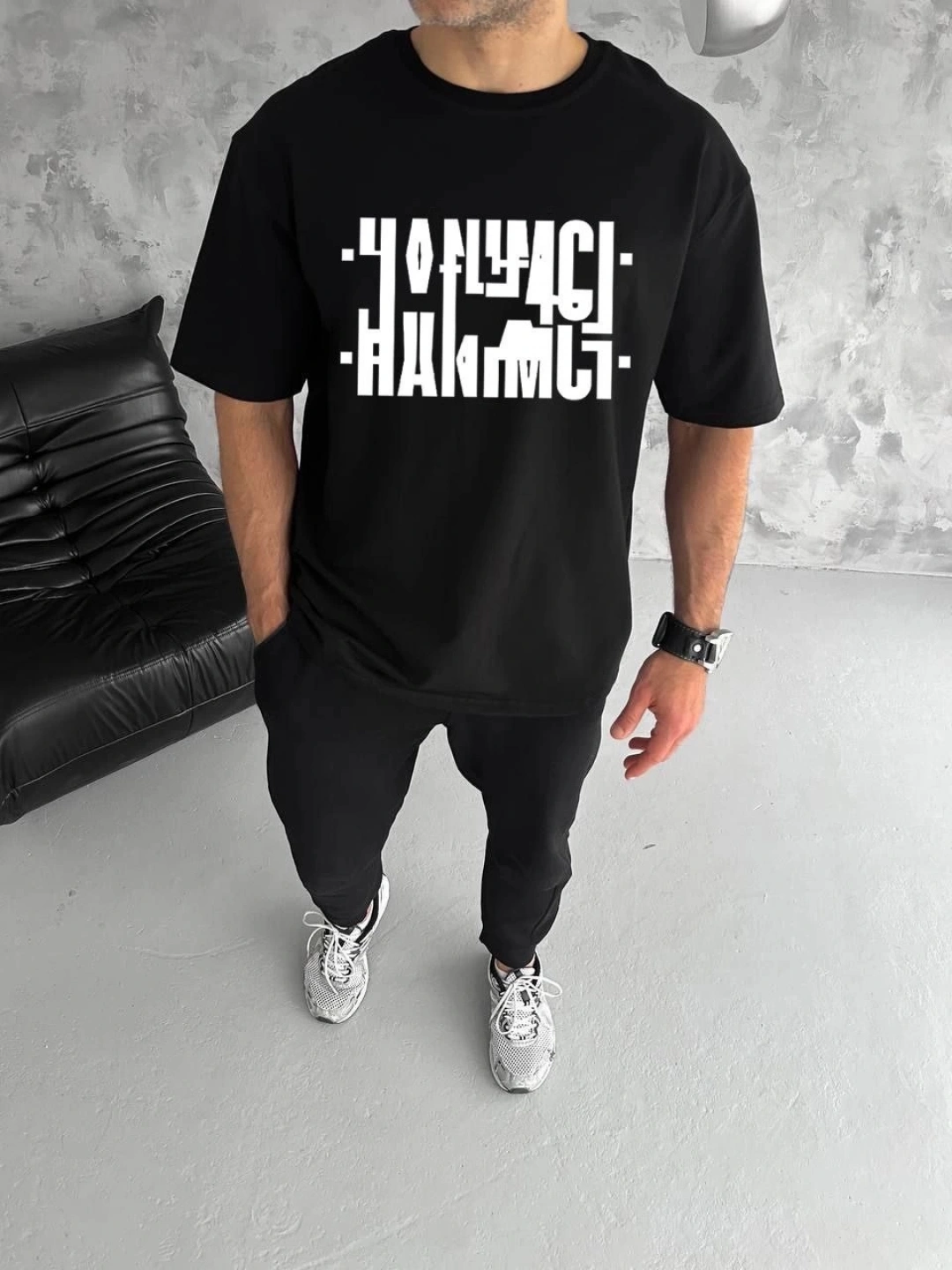 Benzersiz Sırt Baskılı Erkek Sokak Stili Bol Tişört - Nefes Alabilir Polyester, Makinede Yıkanabilir - Siyah