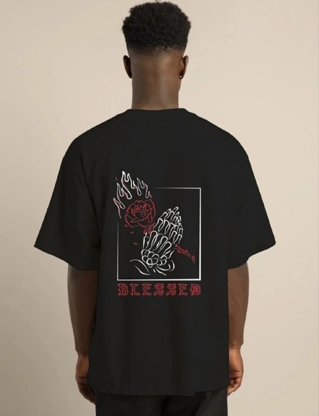 Benzersiz Sırt Baskılı Erkek Sokak Stili Bol Tişört - Nefes Alabilir Polyester, Makinede Yıkanabilir - Siyah