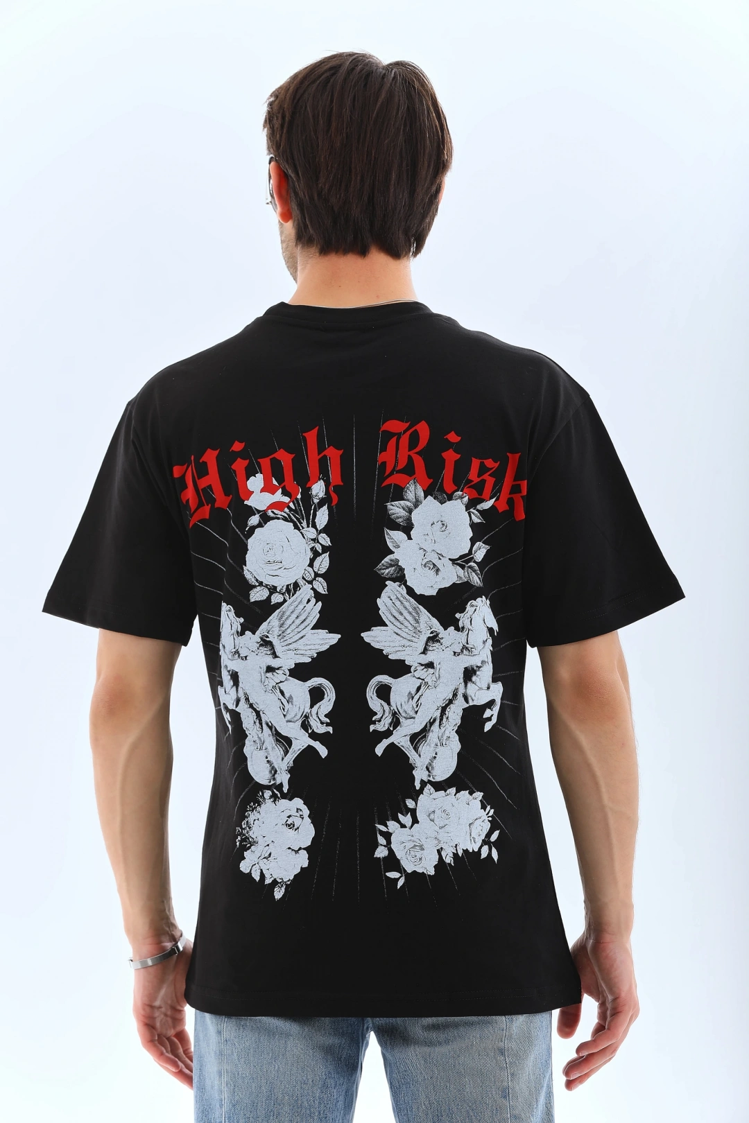 Unisex Oversize Baskılı Bisiklet Yaka T-Shirt - Siyah