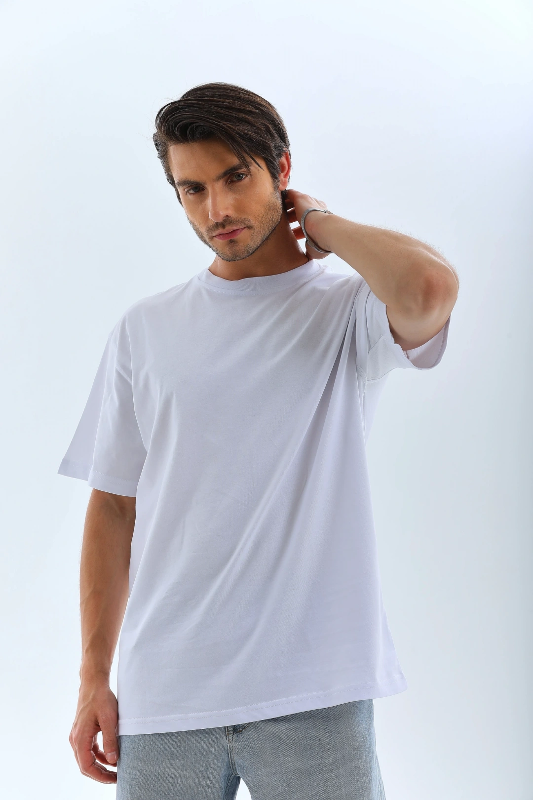 Unisex Oversize Düz Bisiklet Yaka T-Shirt - Beyaz