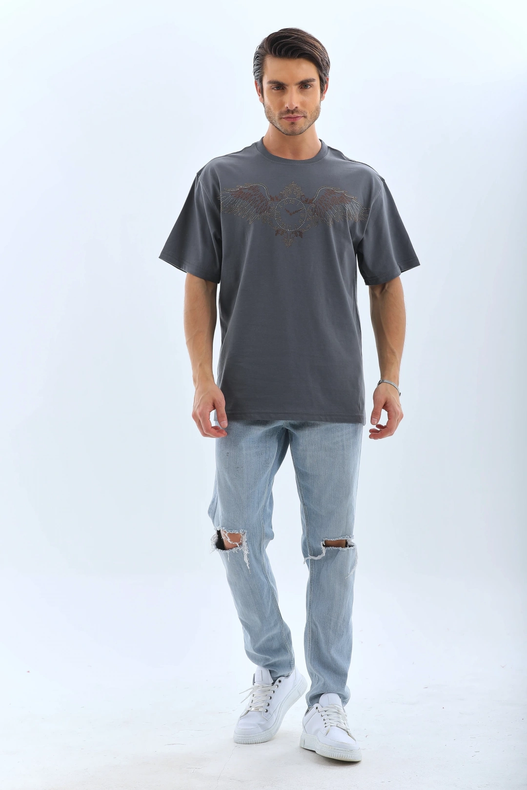 Unisex Oversize Taşlı Bisiklet Yaka T-Shirt - Füme