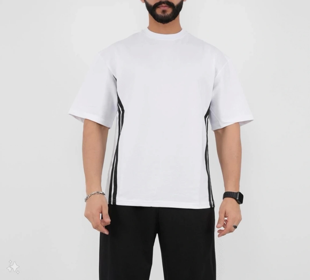 Unisex Oversize Yanları Şeritli T-Shirt - Beyaz