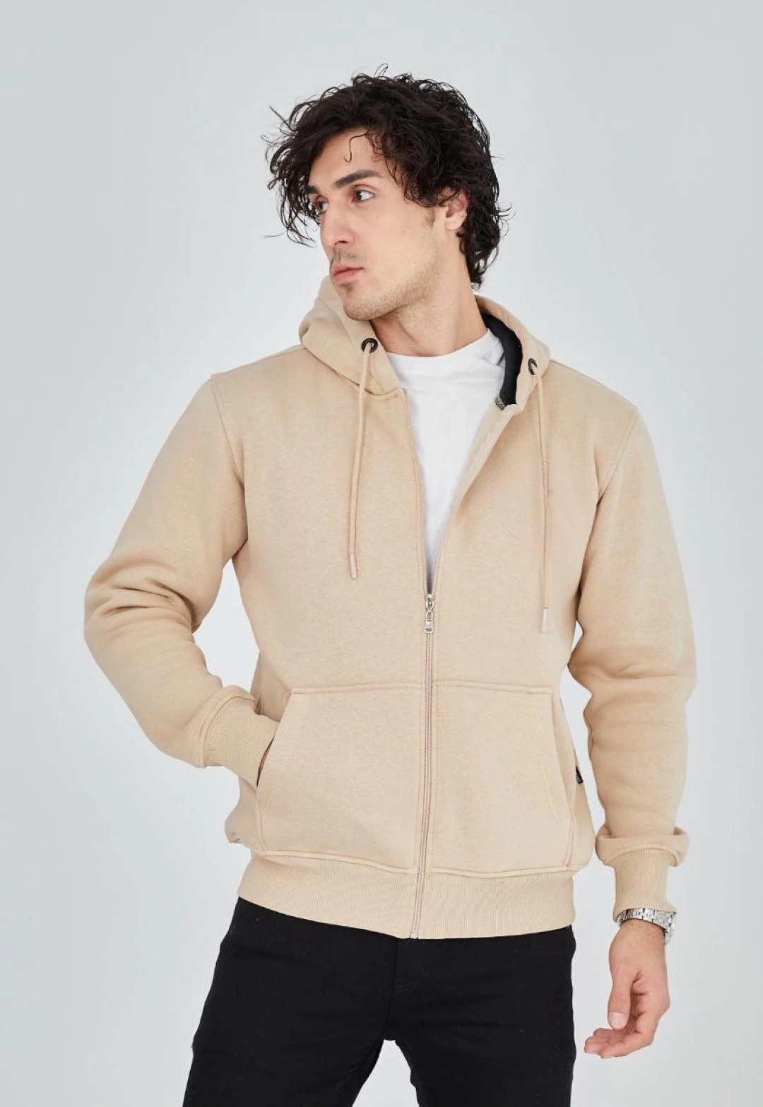 Unisex Tam Fermuarlı Kapşonlu SweatShirt - Bej