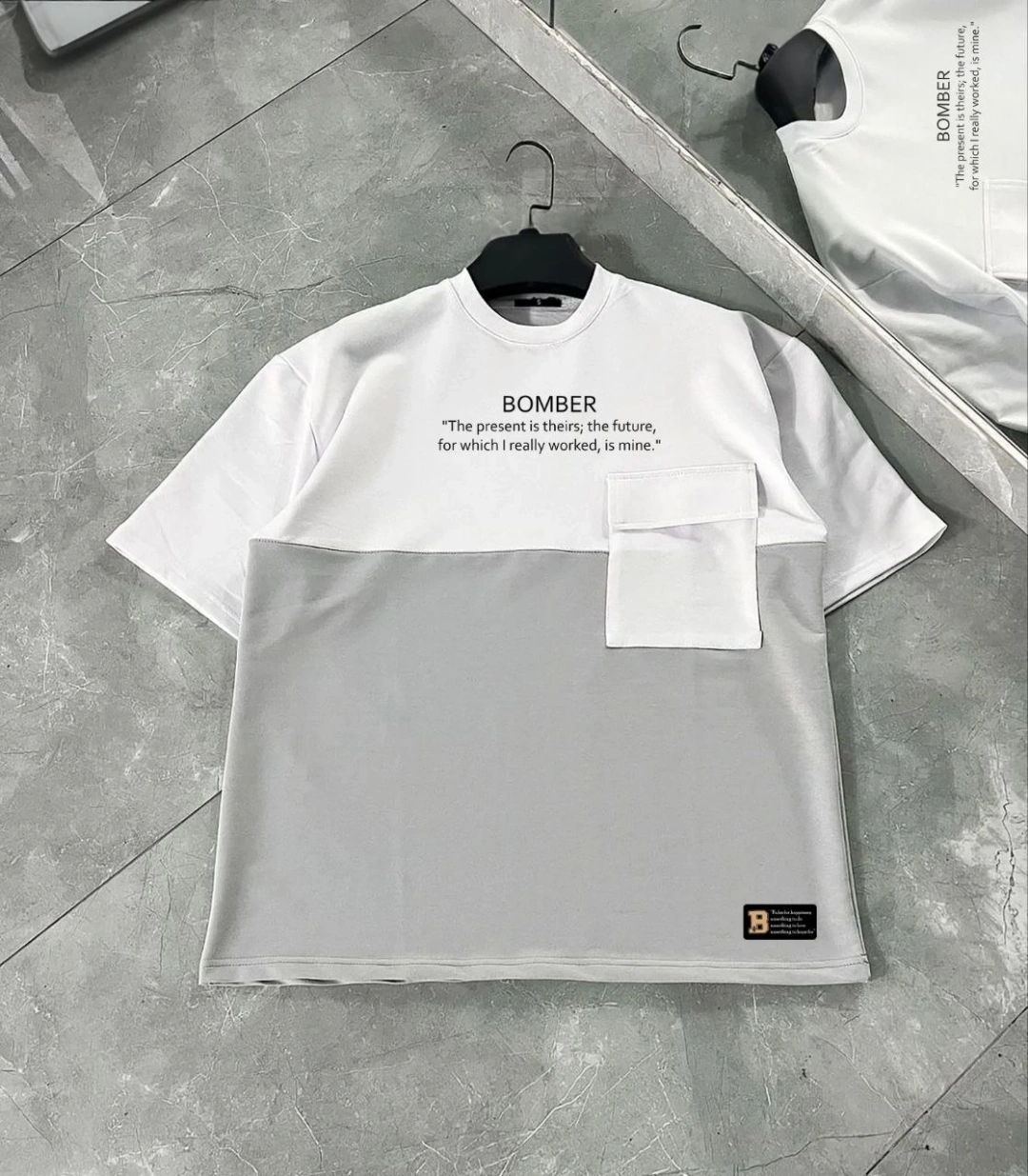 Unisex Torba Cep Detaylı Parçalı T-Shirt - Gri