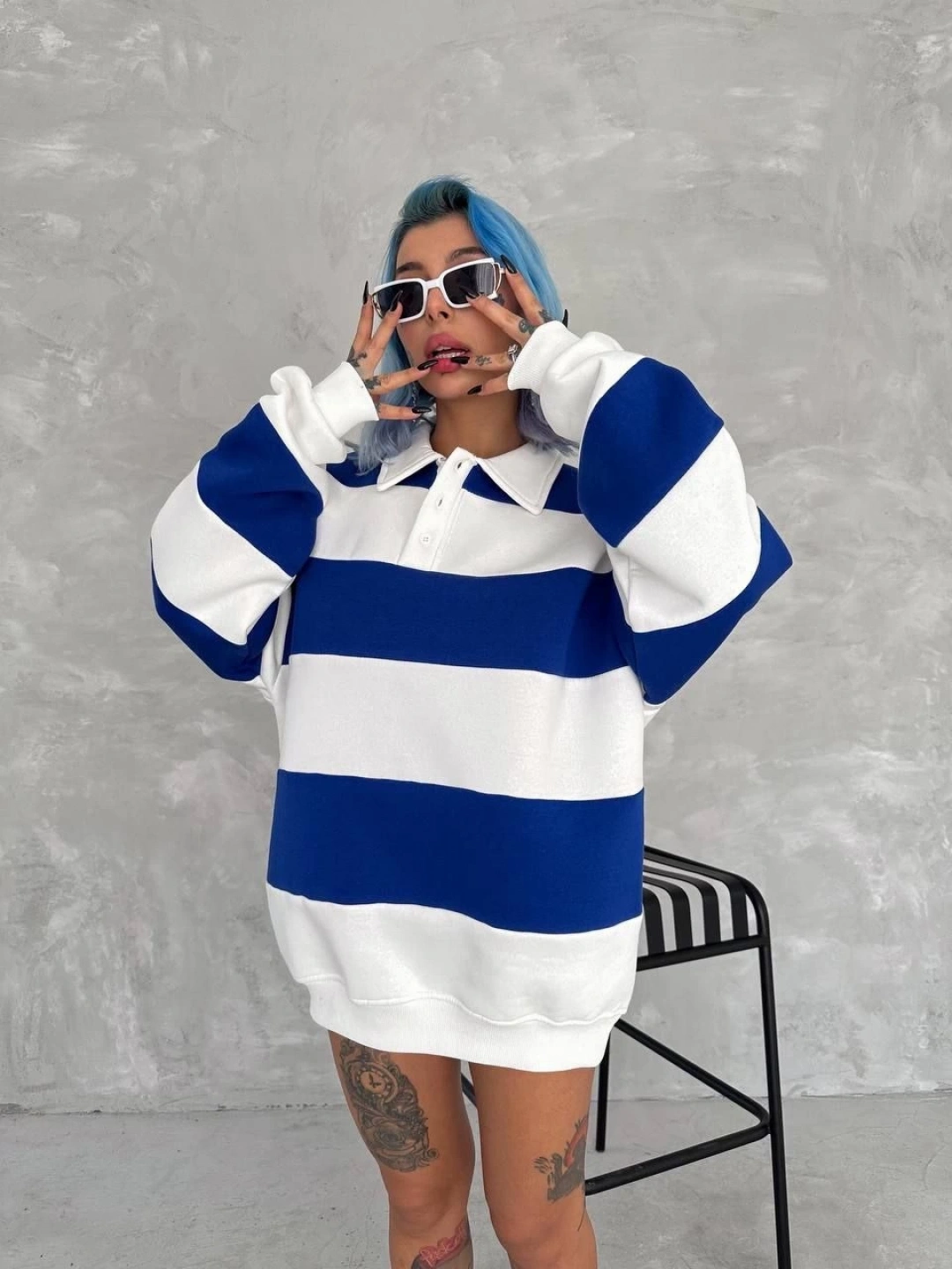 Unisex Üç İplik Parçalı Yakalı SweatShirt - Mavi