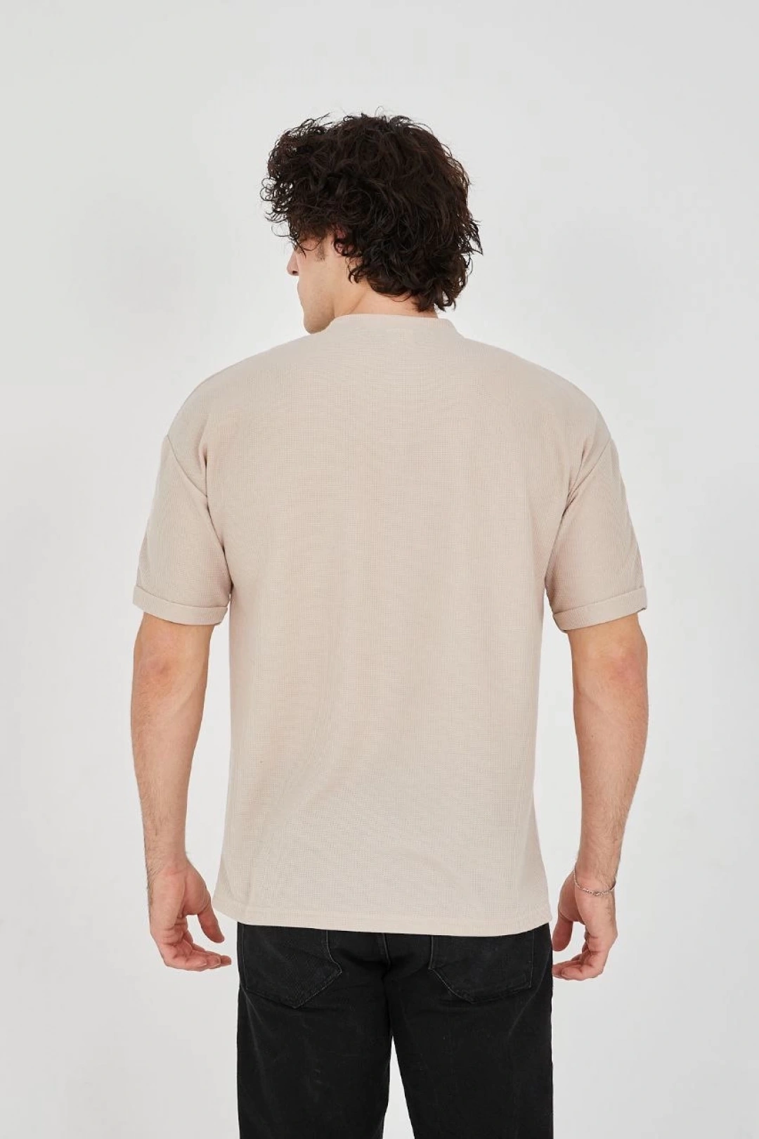 Unisex Waffle Kumaş Rahat Kol T-Shirt - Bej