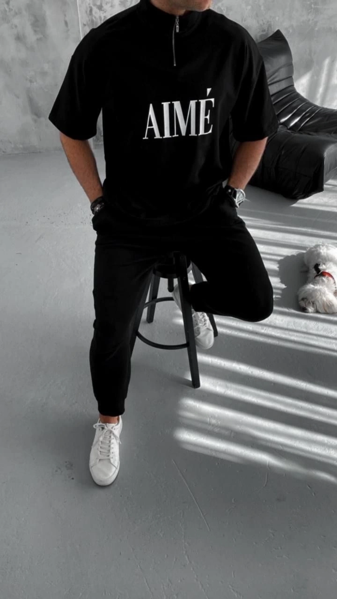 Unisex Yarım Fermuarlı Baskılı T-Shirt - Siyah