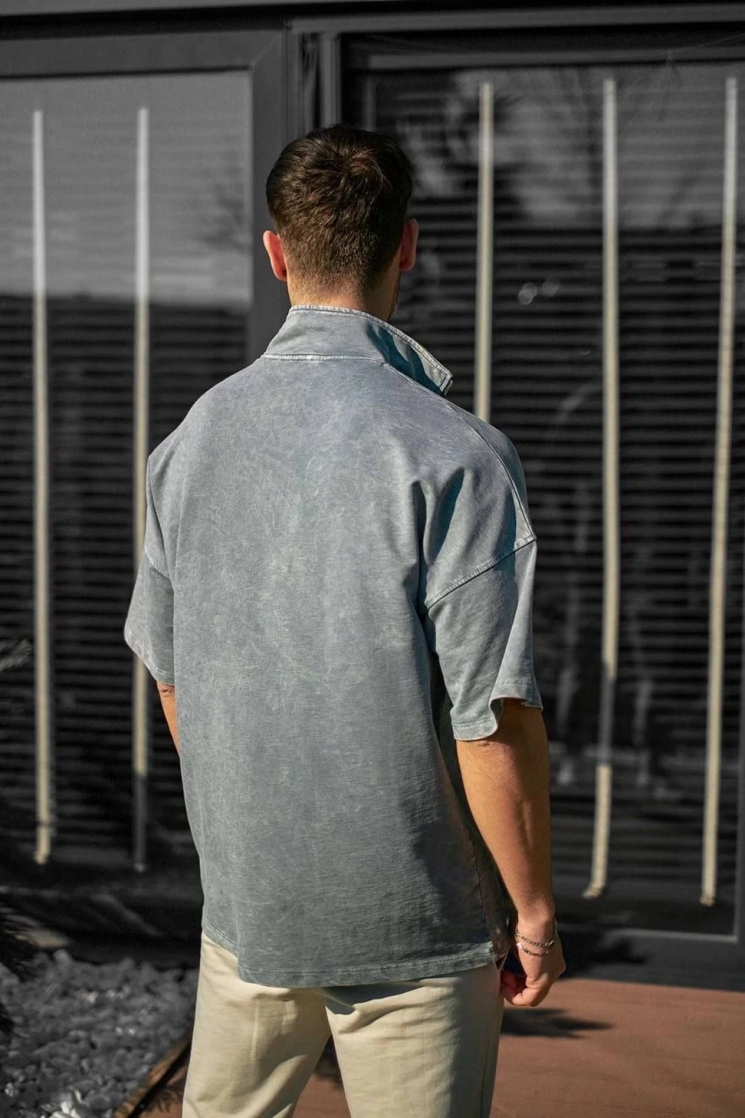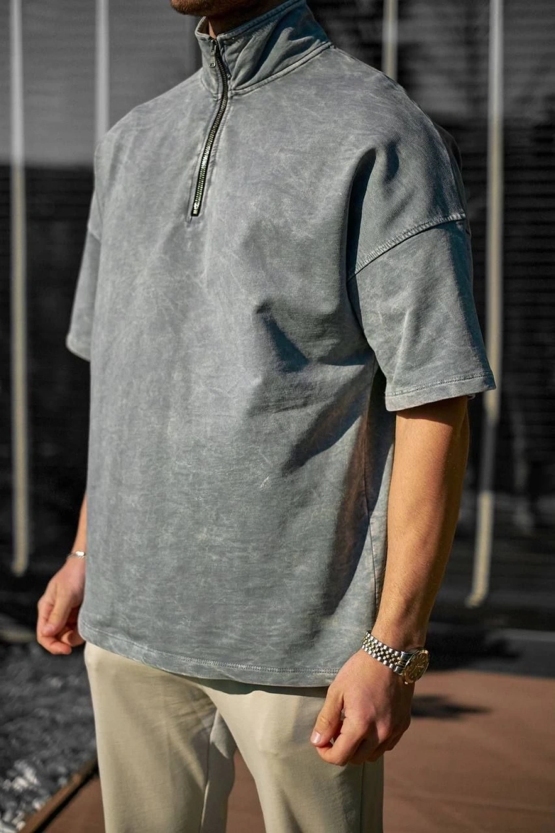 Unisex Yarım Fermuarlı Yıkamalı T-Shirt - Gri