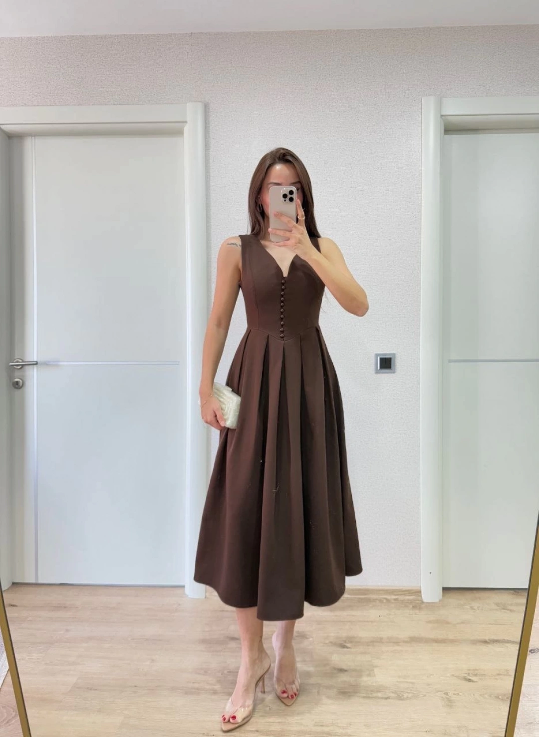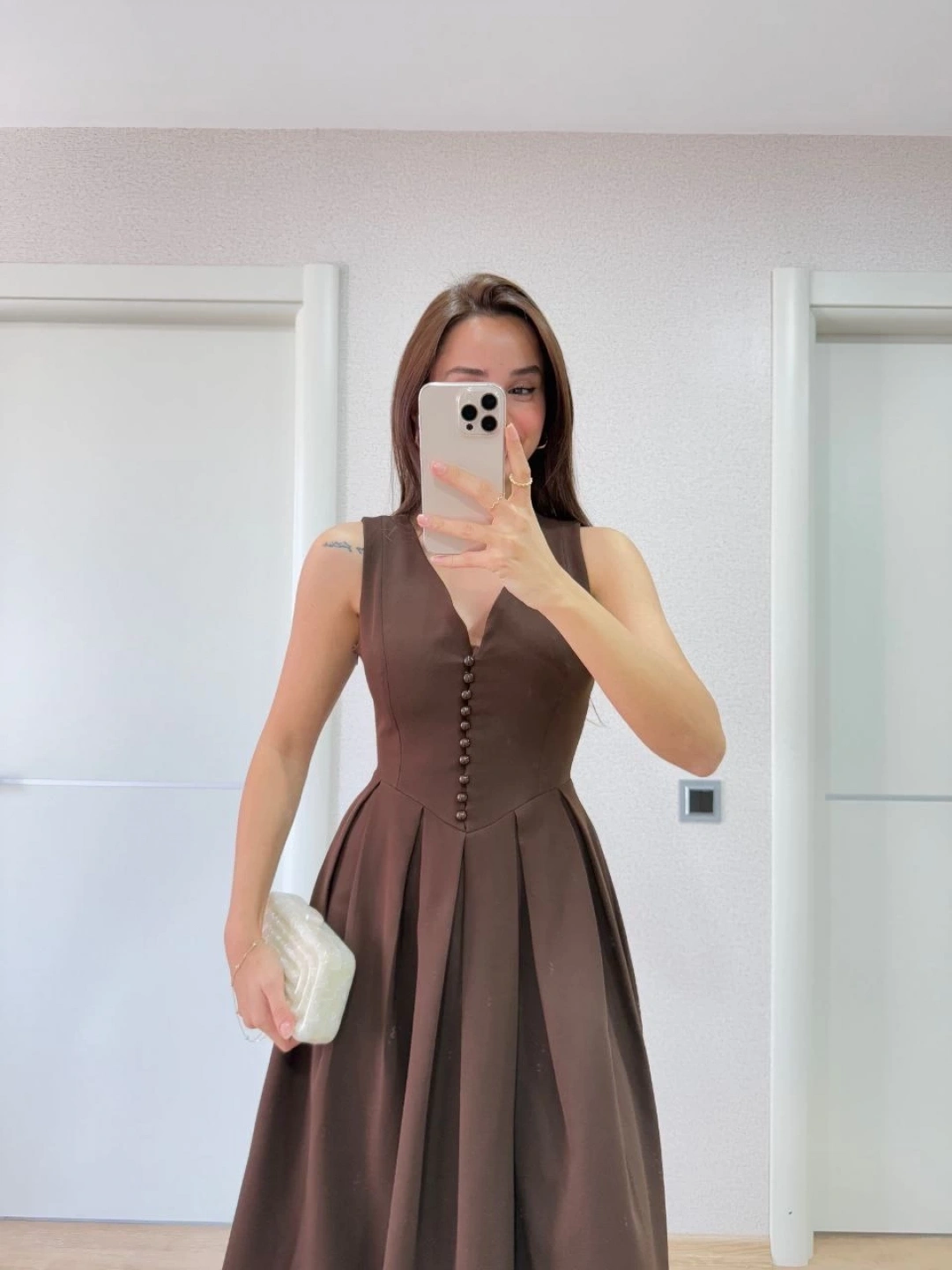 Detay | Arkadan ve önden Pens Detaylı , Göğüste ince boncuk Detaylı , Kolsuz , Uzun Elbise , V Yaka , Yandan Fermuarlı |