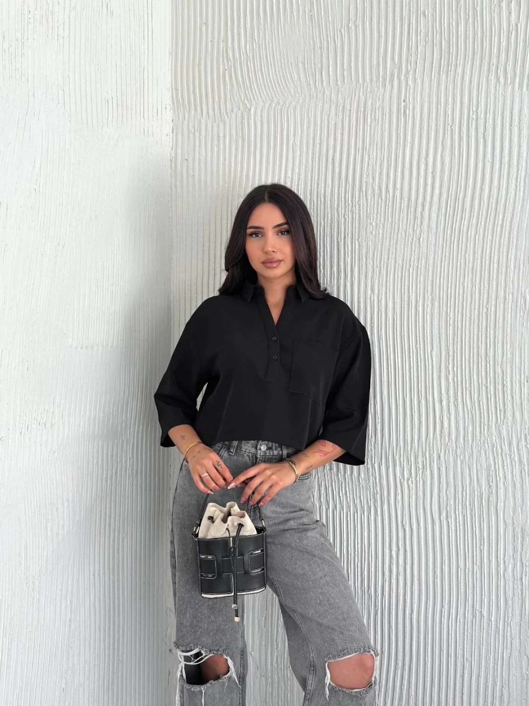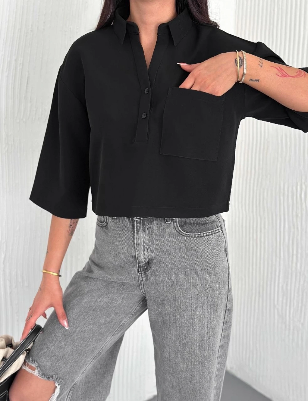 Detay | Cepli , Crop , ilik Düğmeli , Üç Çeyrek (3/4 Sleeve) Kol , Yakalı |